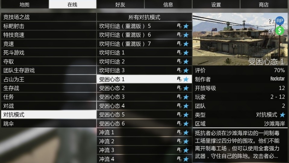 开启方式:ESC-在线-差事-进行差事-Rockstar制作-对抗模式