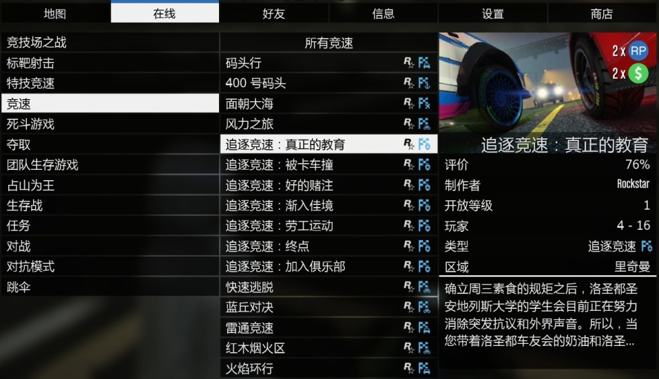 开启方式:ESC-在线-差事-进行差事-Rockstar制作-竞速/车友会内部直接匹配