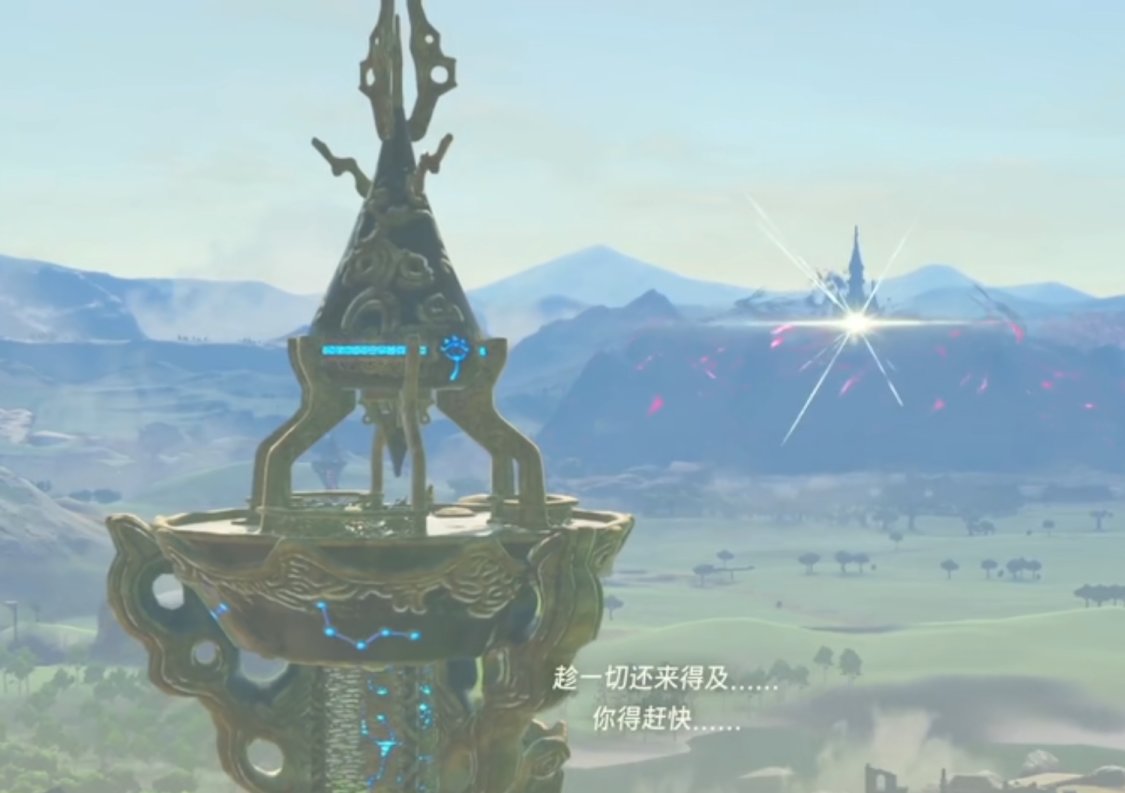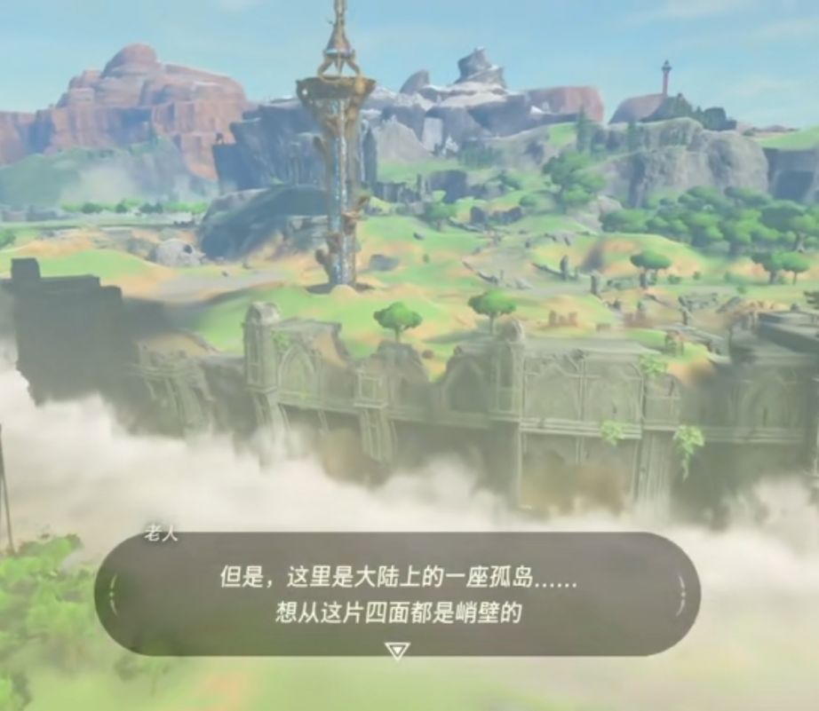 老人指了指不远处的一座矮尖塔,又指了指林克的腰部:“你先用你腰上的东西去把那座塔激活,我在这等你。”