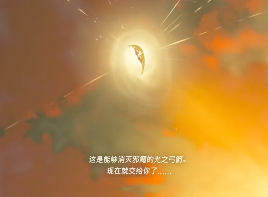 被囚禁在盖侬体内顽强抵抗的塞尔达公主此刻苏醒过来,将蕴含光之力的弓赐予林克。