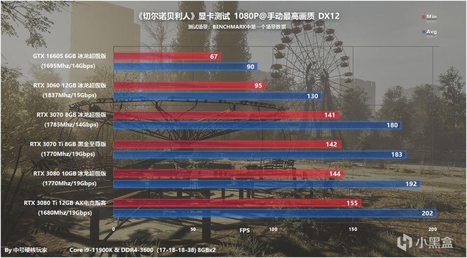 游戏优化还不错,像主流级的GTX 1660 SUPER也是能找到它最合适1080P定位,平均可以达到90帧,不过帧数落差可能较大。至于RTX 3060级别以上的显卡,都能大幅度越过100帧以上,尤其是RTX 3070就能较好满足高刷新率显示器,根本不需要动用到RTX 3080 Ti,在1080P分辨率它们俩差距只有12%左右而已,这里就不测试1080P分辨率的DLSS性能了。