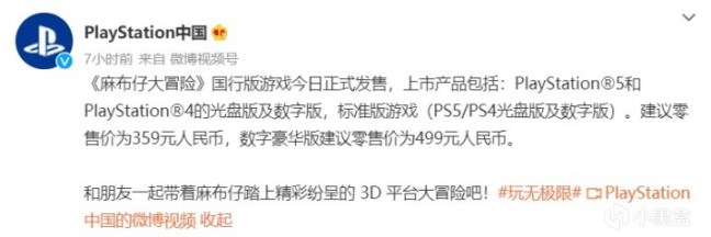 PlayStation官方微博,索尼互动娱乐(上海)有限公司今天宣布,国行PS5第一款光盘版游戏游戏,将于8月17日在中国大陆地区发售的《麻布仔大冒险》标准版游戏(PS5/PS4光碟版及数字版)官方建议零售价为359元人民币,数字豪华版则为499元人民币。