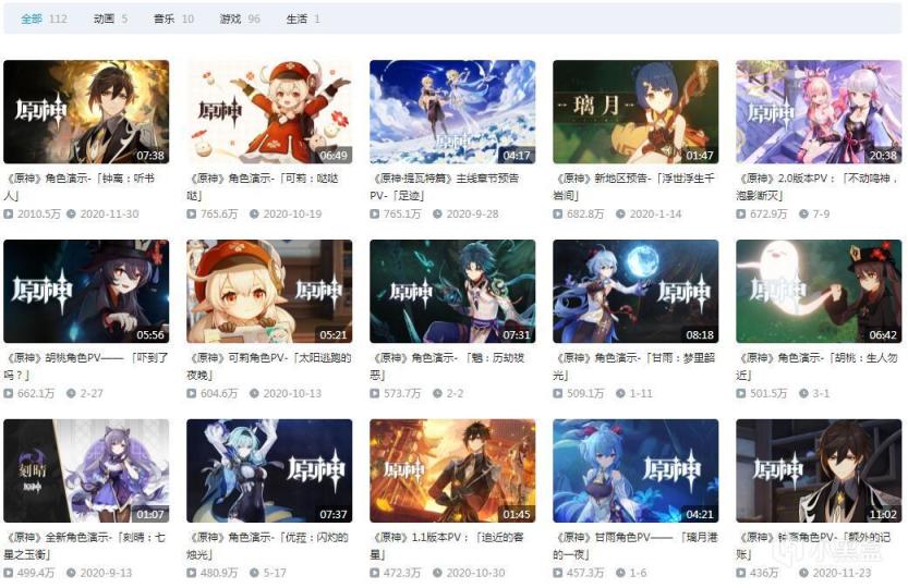 除了钟离这个演示视频之外,其实原神官方发布的其他视频,播放量也不低。游戏日报君大致数了一下,截至到现在,原神官方在B站总计发布了112个相关视频,其中有97个视频播放量超过100万,其中最低的一个播放量也有46.2万,这……确实有点夸张。