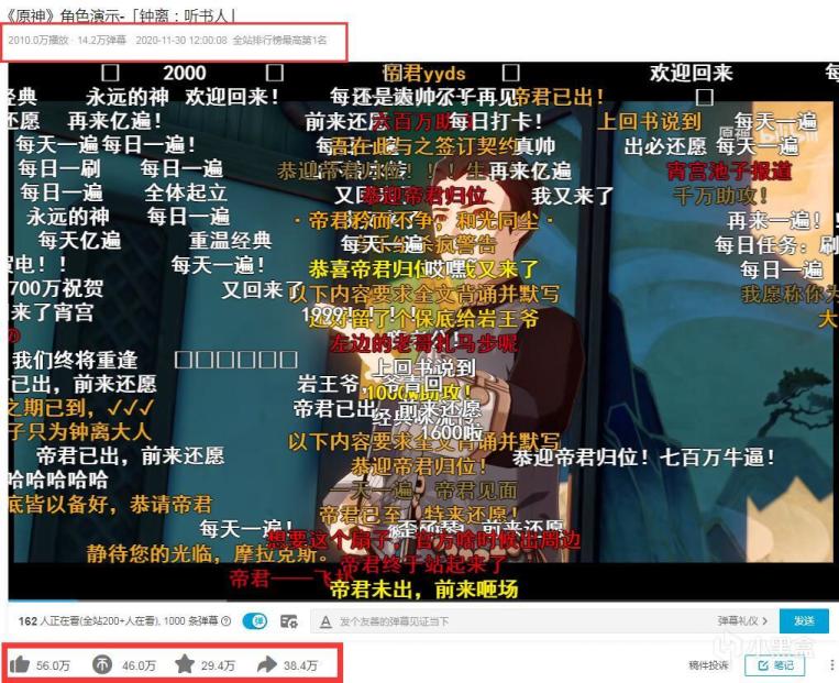 截至目前,钟离《听书人》这个视频的播放量依然还在持续上涨之中,不少原神玩家以及闻风而来的路人网友,都跑去视频中打卡签到,除了播放量突破2000万之外,点赞、转发和投币数分别达到56万、38.4万和46万。