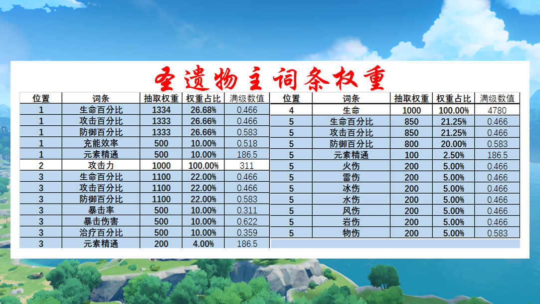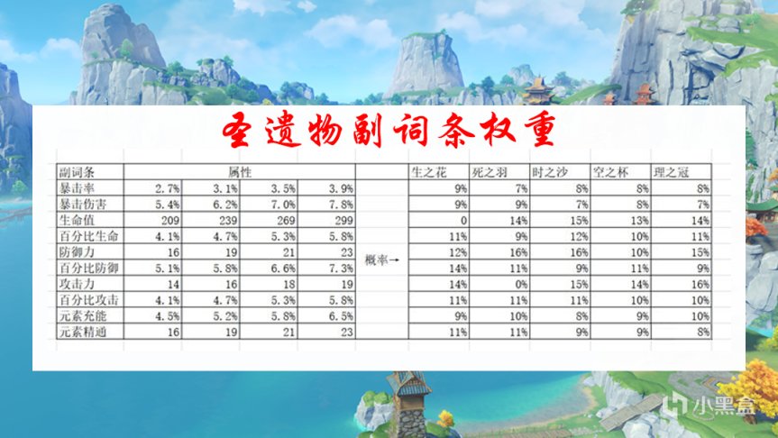 这仅仅是主词条的概率,基数越大越容易出现副词条让你满意的圣遗物。这也是为何花、羽毛、时之沙会比较容易刷出合适的圣遗物。头与杯子由于所需词条(双暴、元素)普遍出现的概率偏低,因此玩家的树脂也多耗费在这块儿,散件大部分都是在头或杯子之间选择。