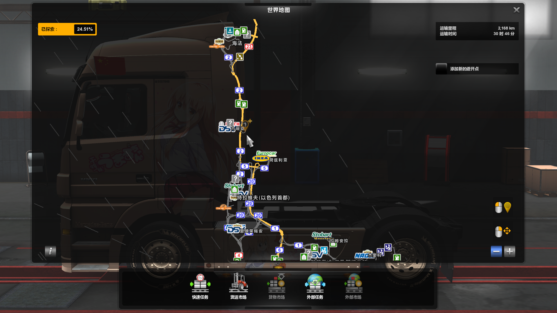 这张地图制作蛮精细的,基本上把那一片区域的道路连接真实的还原出来了。并且还是1:1的还原,所以在这张地图上,卡车提速会变慢,并且游戏时间也是按照真实时间运转的。城市精细化程度很高,几个港口大概是1:10还原?模型分辨率也比原版欧卡模型高了不少,并且不吃配置。