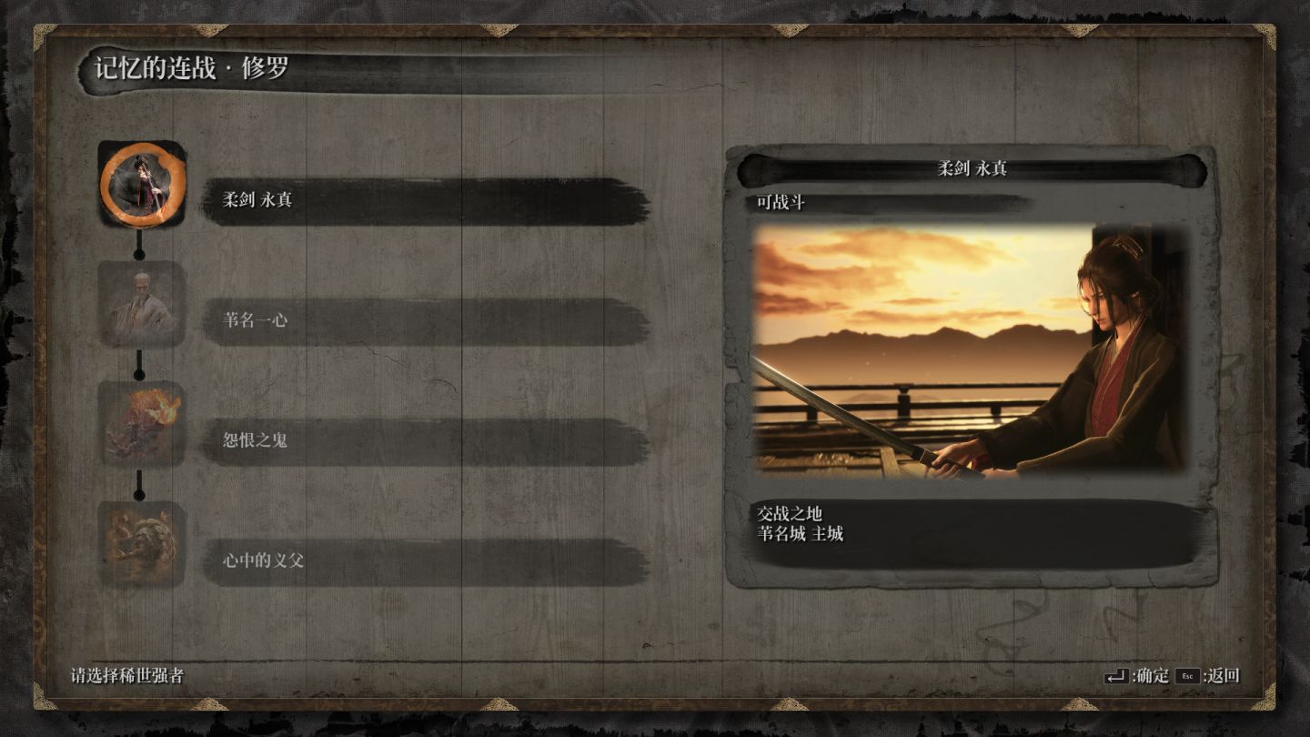 而修罗路线解锁,我们需要在表世界击败永真,老一心,怨恨之鬼,壮年义父四个boss,并且通关修罗结局(有些人就是因为壮年义父没打所以没有修罗路线)