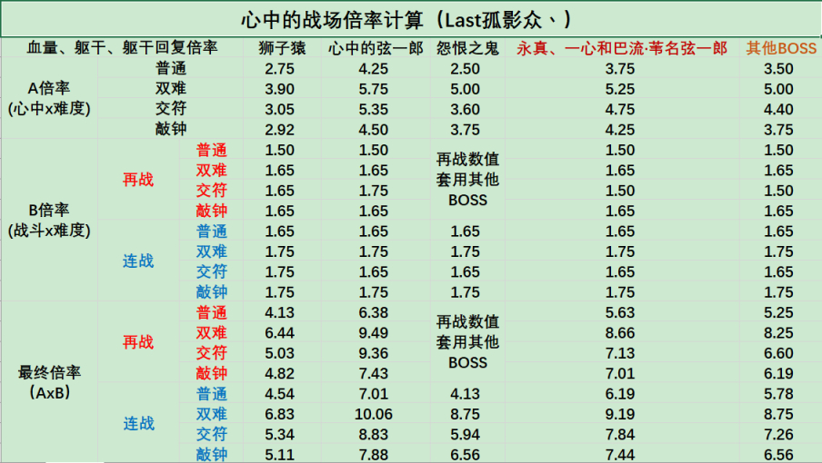 这里要注意的是,心中的战场并不是每一个boss的倍率都是不同的,有很多boss都是被放在一起计算,例如永真,一心和巴流苇名弦一郎他们三个的倍率就是相同的,也就是绑定在一起。