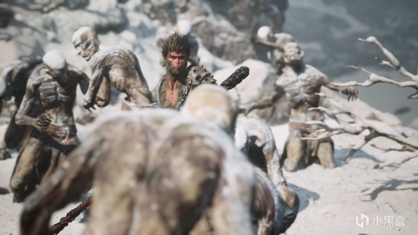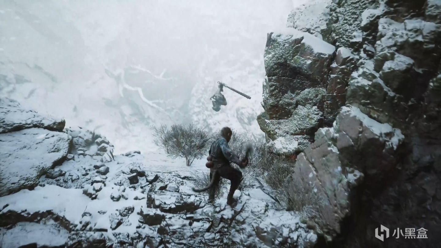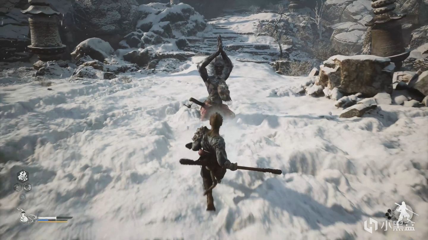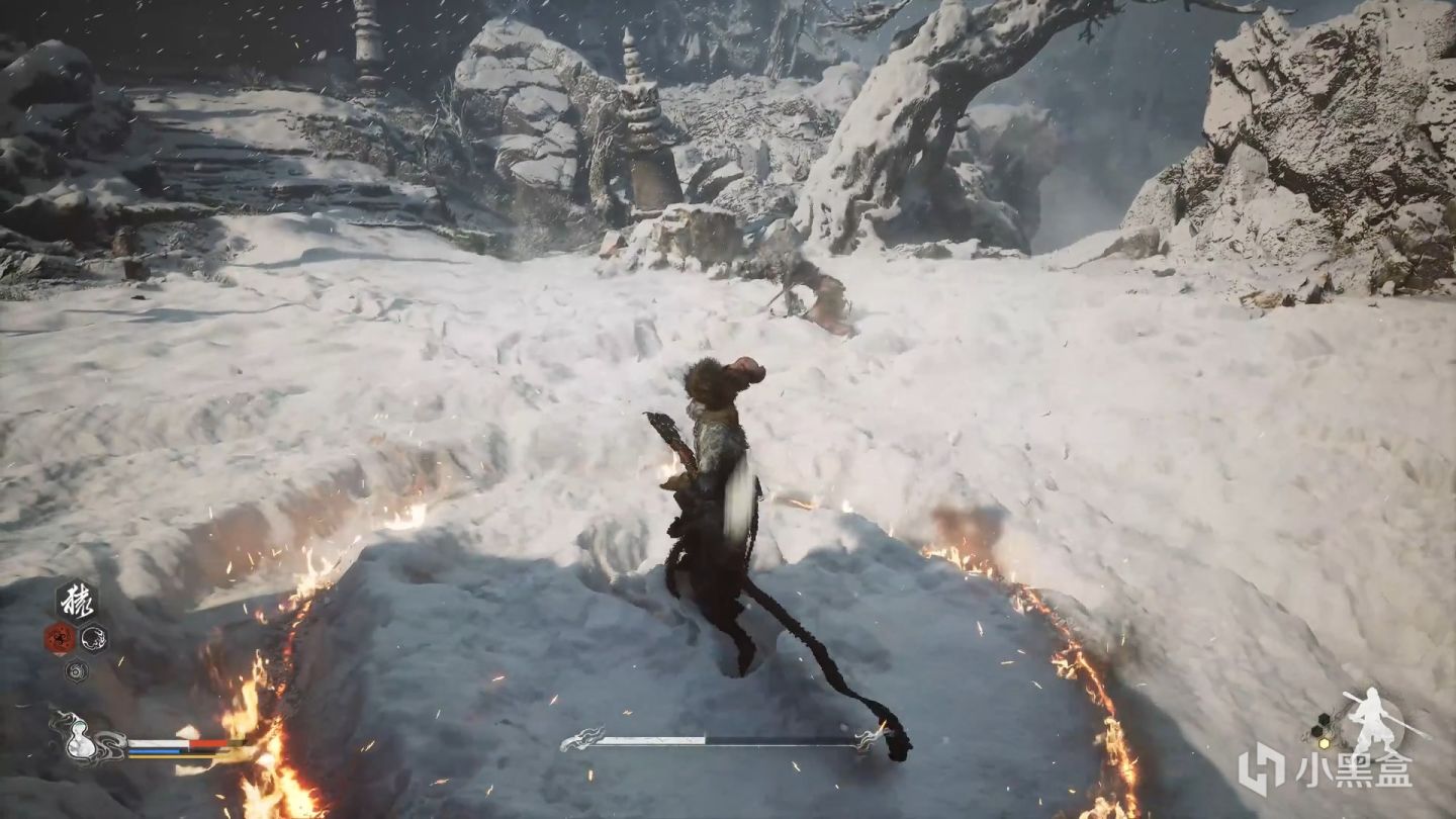 说真的,这雪太牛了,12分钟视频演示了猴哥雪地的一段实机操作,让人不得不想起荒野大镖客2开局,亚瑟骑着马跟在达奇背后的场景,在雪地里轧出一道道痕迹。黑悟空神话的雪地场景,由一个狼牙棒挥动手中的狼牙棒展开(棍子略显穿模),但你甚至能看到雪地有一块因为重力向下塌陷的小细节。
