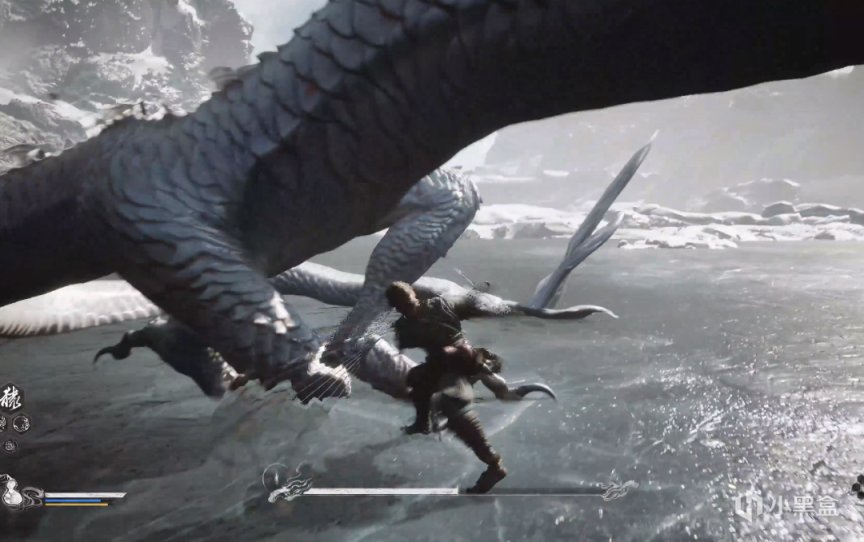 最后与白龙的战斗中,可以看出游科为大型怪物做了非常精细的骨骼绑定。白龙飞行时动作非常舒缓流畅。通过截图可以看出,倒地时白龙多次试图用左侧两肢撑地起身,四肢的协调性表现很好。而且在悟空被白龙放出的闪电命中后,身体环绕着电光,血量条明确地表现了此时的人物属性状态。