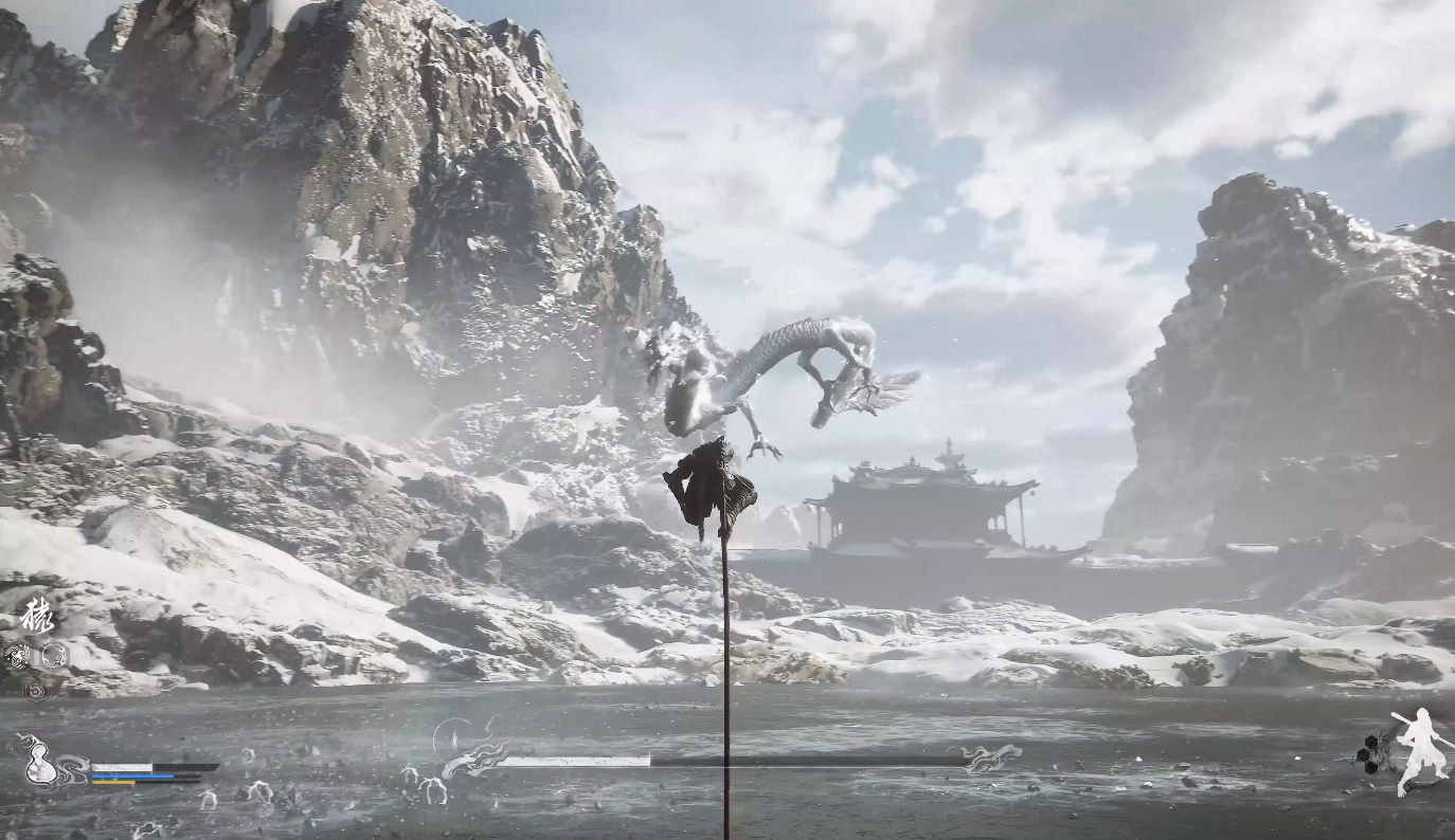 还有一点值得提及,就是在白龙战中,悟空可以自如地伸缩棍棒躲避AOE伤害。而且伸长后的棍棒打在迎面冲来的白龙时,造成了接近四分之一血量的高额伤害。