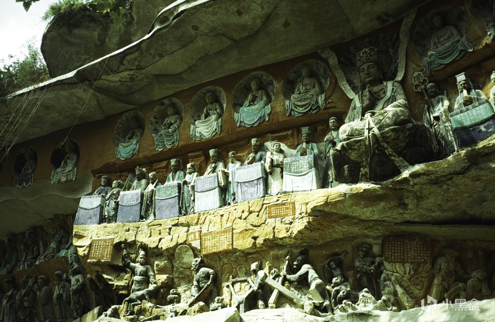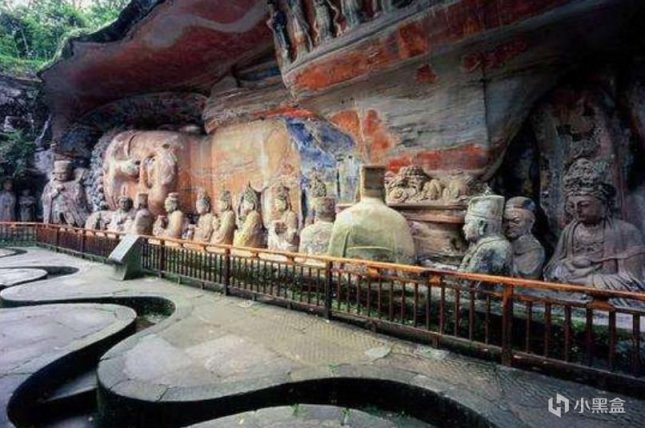 大足石刻分布于大足区西南、西北和东北的扇区,一共23处,大多集中在宝顶山和北山的19处,其中宝顶山摩崖造像规模最大,造像最精美,可以看到造像身上如今还留有彩色(前后 多次修复),实机演示开头的那些造像大多都是来源于大足时刻宝顶山上”摩崖造像“的思路,下图即为黑神话悟空所使用的原型。