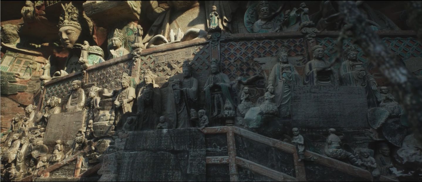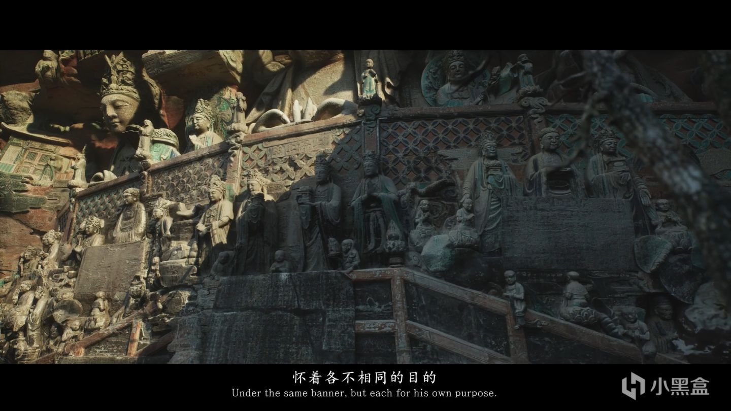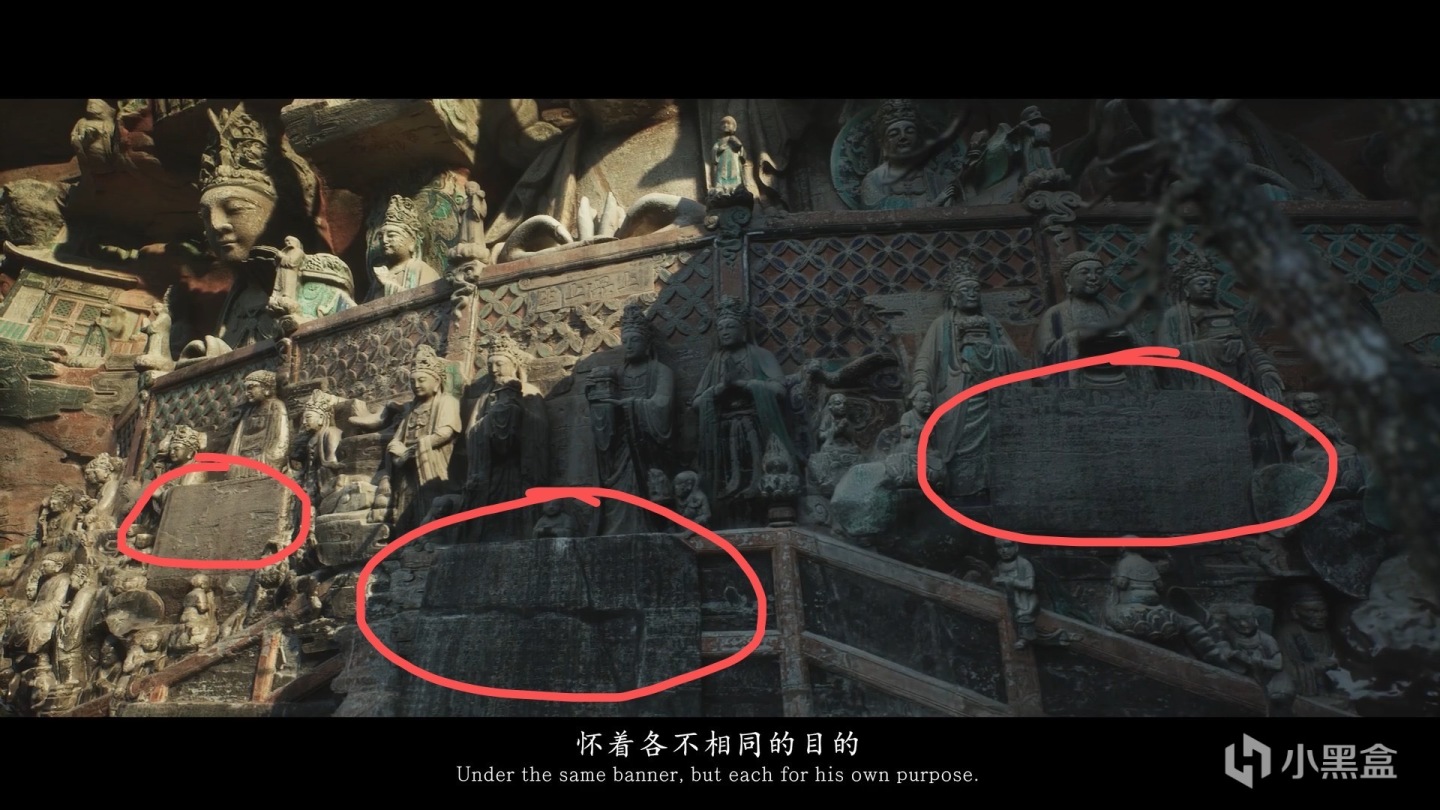 可以看到下图左上角的石刻刚好对应到上图(观无量寿佛经变相)。所谓摩崖造像,就是在山崖上刮摩或在石头上刻划出的造像。再给大家看这张图片,可以看到黑神话悟空团队,有非常细节的做旧以及彩色,回想到西游记大致的时期距离唐朝也已千年,这样的还原相当真实贴切,搭配上高模和DLSS的效果也非常出色,原创团队用心了。