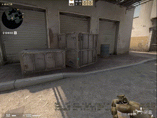 如果第二时间防到A包点的你同时看两个方向有点难受,这时候不妨试试扔一颗小道的满封烟,或者过点满火(站箱子上也能烧到的那种哦)只需要瞄着这个箱子上的这根黑线往上来一点即可。