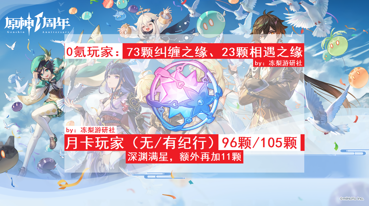 为了方便规划池子,将原石统一转化为纠缠之缘(相遇之缘未计入),0氪玩家73颗;月卡玩家96.7颗;月卡纪行玩家105颗。按照此前玩家自发统计的,国服玩家平均出金率为69发,深渊随便整点儿,每个人保底一金应该还是没问题的。
