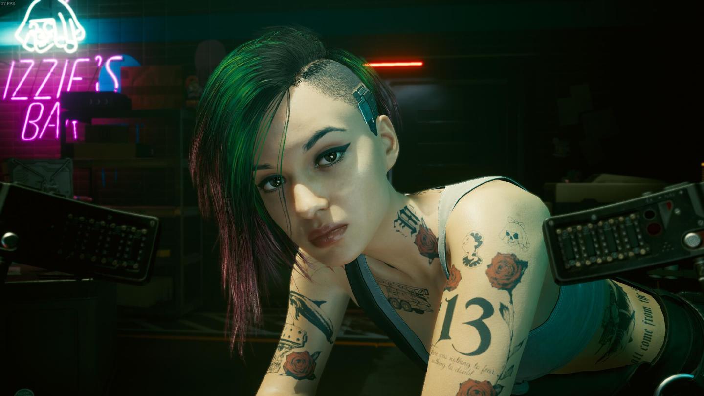 当玩家们第一次进入《赛博朋克2077》的世界时,看到了一群异形脸并怀疑2077年的人的xp怎么那么怪的时候,迎面而来的还算符合2020年人审美的朱迪出现了,并且这一副画面当时也在2077玩家内成为了一张显卡测试图 就你那烂显卡还想玩我.jpg