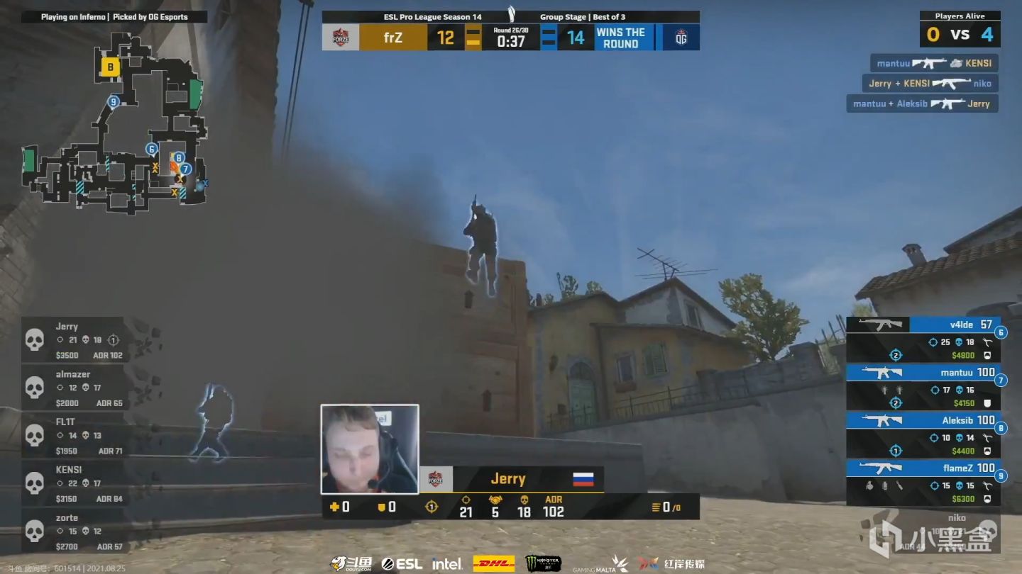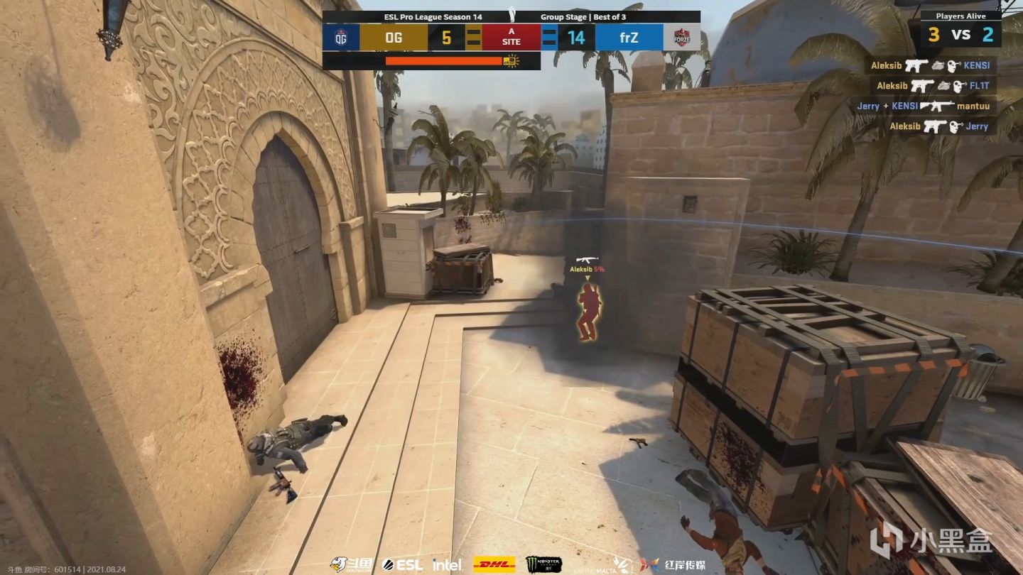 第二十回合,OG准备选择放赛点了,然而在进入A区下包后,Aleksib混在警家面前的烟雾里,随着烟雾散去,Aleksib一把tec9直接先双杀警家又反杀包点CT,成功为OG抢下下半场第一分,比分来到14-6。