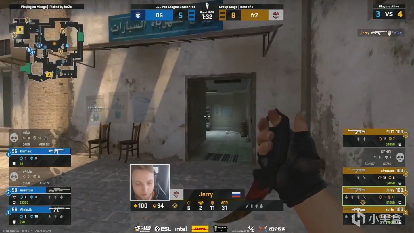 手枪局forZe以CT开局,Jerry双枪在二楼只做到1换1,OG成功进入包点下包并进入3v1局面,KENSI表面搜点被架死,OG成功拿下手枪局。