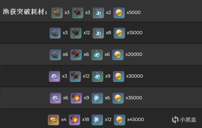 渔获的升级素材:混沌真眼(遗迹机兵掉落)、今昔剧画之鬼人(秘境砂流之庭掉落)、浮游晶化核(漂浮灵掉落)。玩家可看情况提前收集部分材料,便于在后续直接拉满渔获。