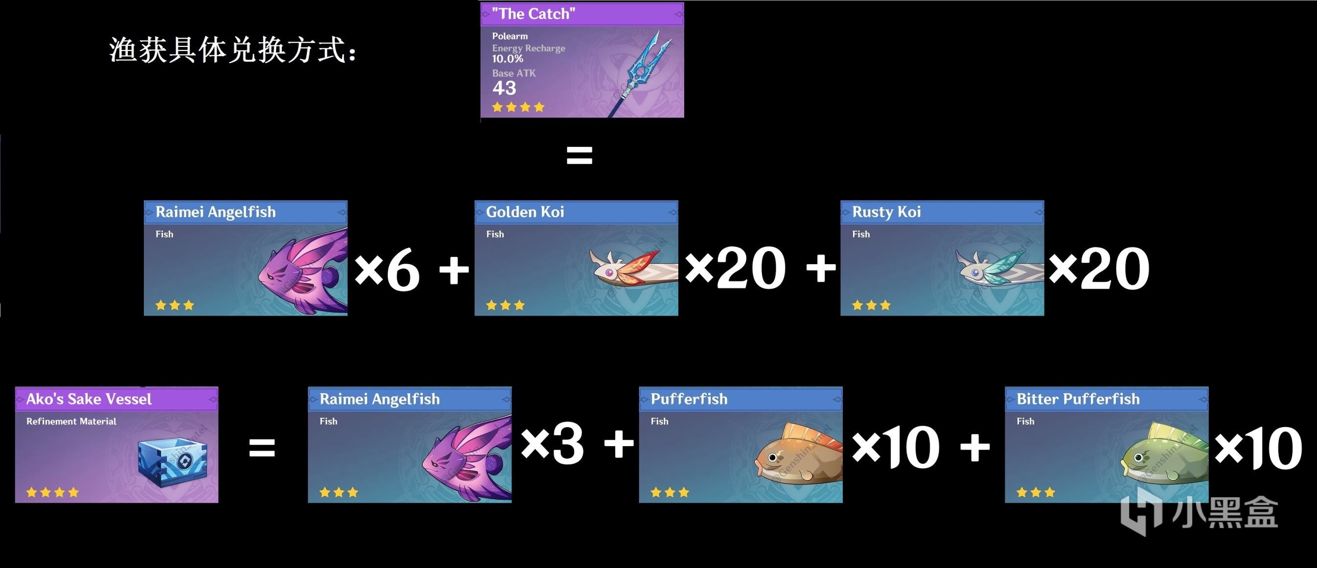 稻妻可兑换:鸣川鹈饲鱼竿、长柄武器渔获、精炼材料赤穗酒枡。已知实装鱼类为23种,1把渔获需要6条流纹京紫蝶鱼+20条金赤假龙+20条锖假龙,1份赤穗酒枡需要3条流纹京紫蝶鱼+10条炮鲀+10条苦炮鲀。可见想要获得满精的渔获需要点儿时间。