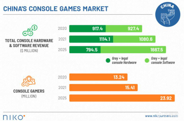 根据 Niko Partner 最新关于国内主机游戏市场的报告,2020年中国主机市场总额约为18.4亿美元,主机玩家人数达到1320万,根据他们的估计至2025年国内主机市场总额可能达到24.6亿美元,而玩家数将增至2390万。