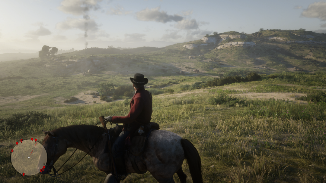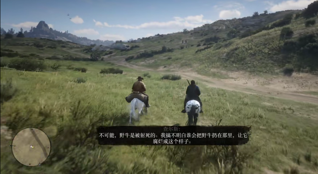 2.游戏前期有一个主角与查尔斯打猎野牛的任务,而当其两人赶到预定地点后,却发现地上有多具野牛的尸体,而野牛的死亡是枪击导致的。查尔斯查明原因:是偷猎者滥杀无辜并且嫁祸于当地的印第安人身上。