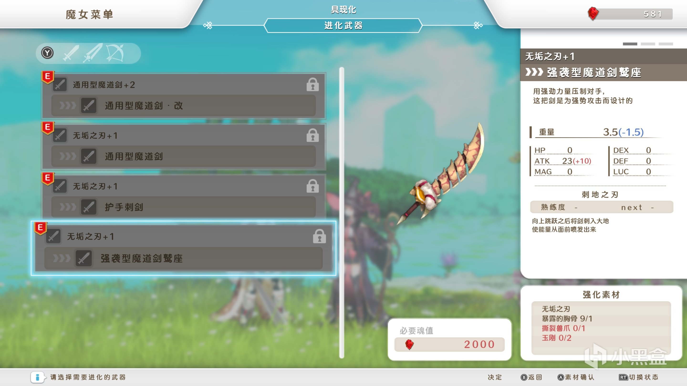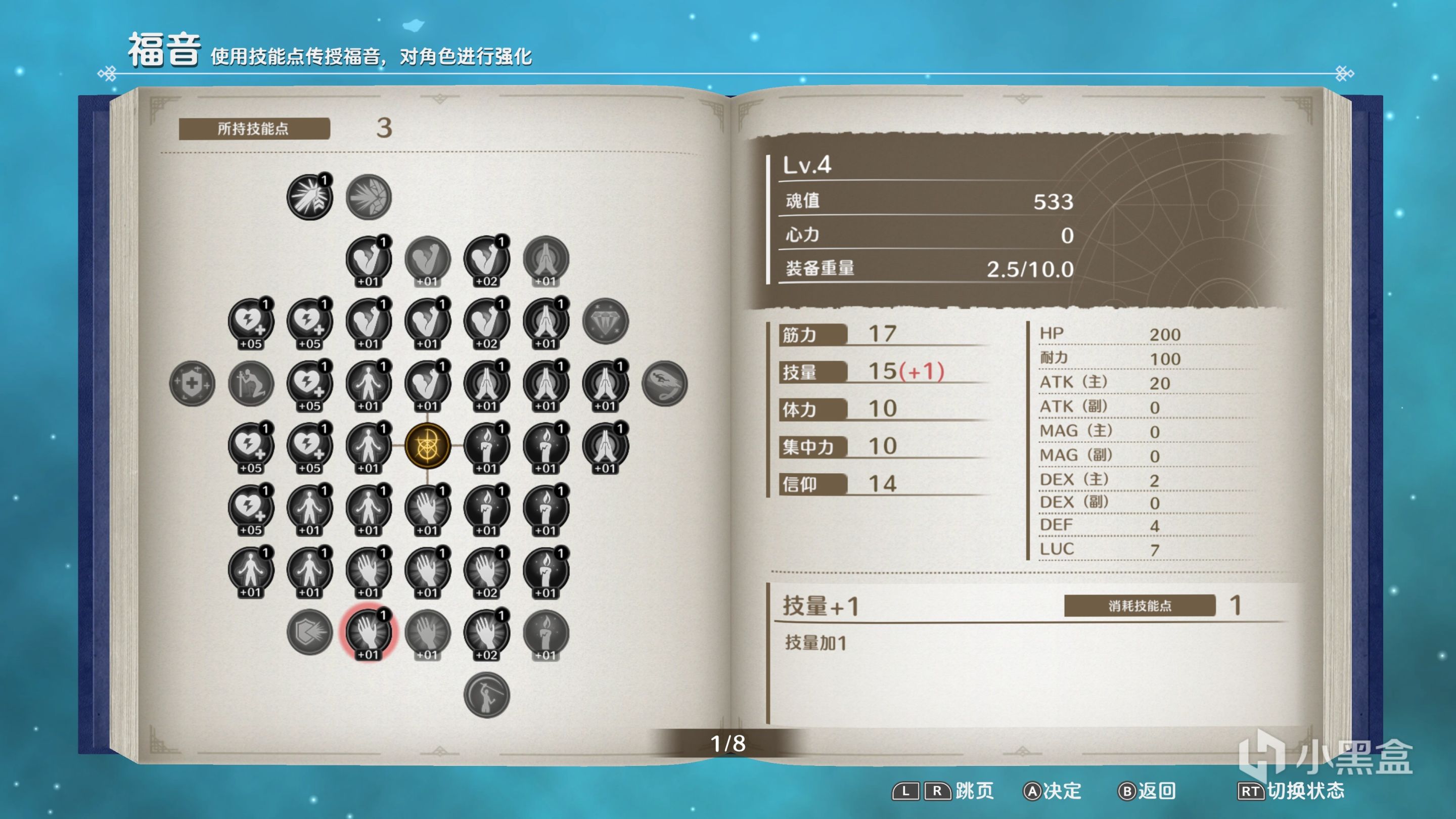 击败敌人、打碎某些物品可以获得魂力,魂力可以提升等级、升级武器或者用来制作道具、装备、饰品,来提升玩家实力。一些不需要的道具也可以在小魔女处转化成魂力。游戏中人物的筋力、技量、体力、集中力、信仰等不同的属性分别对应了类似力量、敏捷、生命值、精力值等属性,但是游戏中升级之后会自动提升相应属性,而不是让玩家自己去选择提升什么属性,属于是简化了游戏的部分内容,让玩家专注于战斗。游戏中可以制作各种不同的道具装备,这些装备还会对筋力、体力等属性有相应的补正,让人物的玩法可以走各种不同流派,百花齐放。