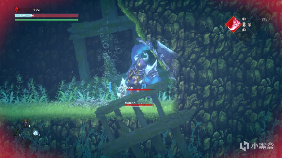 作为一款强调砍杀的动作游戏,本作的动作系统整体上并不复杂,玩起来感觉还是很流畅的,而且群杀敌人的感觉也很爽快。除了常规的轻重攻击,游戏中的人物还会使用“神技”,这是一种类似固定反击的招式,当敌人使用带红光的技能攻击时,使用神技可以反击敌人,并将其打至浮空,还可以在空中继续追加连击,是非常实用的技能。游戏中的敌人除了血槽之外,还有类似《只狼》里架势槽的设定,使用各种攻击方式将敌人的架势槽打满之后,会出现处决标志,此时发动普通就可以处决,处决是无敌的,而且攻击力比较高,但是处决有发动条件的限制,比如必须在地面上处决,无法在空中处决,导致了技能的实用性受到了限制——在水中战斗倒是随时可以处决敌人。