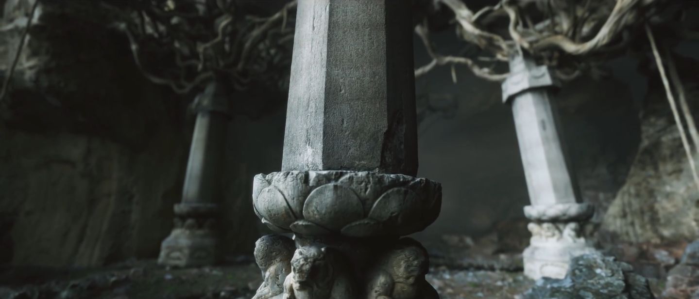 在黑神话悟空这个场景的“经幢”素材中,经幢的元素全部具备——幢顶、幢身和基座,一般游客看到直入眼帘的是幢身,刻有佛教密宗的咒文或经文、佛像等,多呈六角或八角形,场景中经幢的幢顶和基座也很完整,注意经幢一般安置在寺庙、通衢大道或者是墓道中,此处萧瑟的场景也有墓道的气氛,黑神话中真正的佛经恐怕已不存于世。