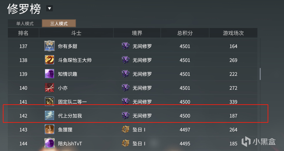 以当前单、三排排行榜举例,目前游戏单排榜单中只有1位无间修罗玩家,而对比三排榜前140位玩家则都是清一色无间修罗段位。