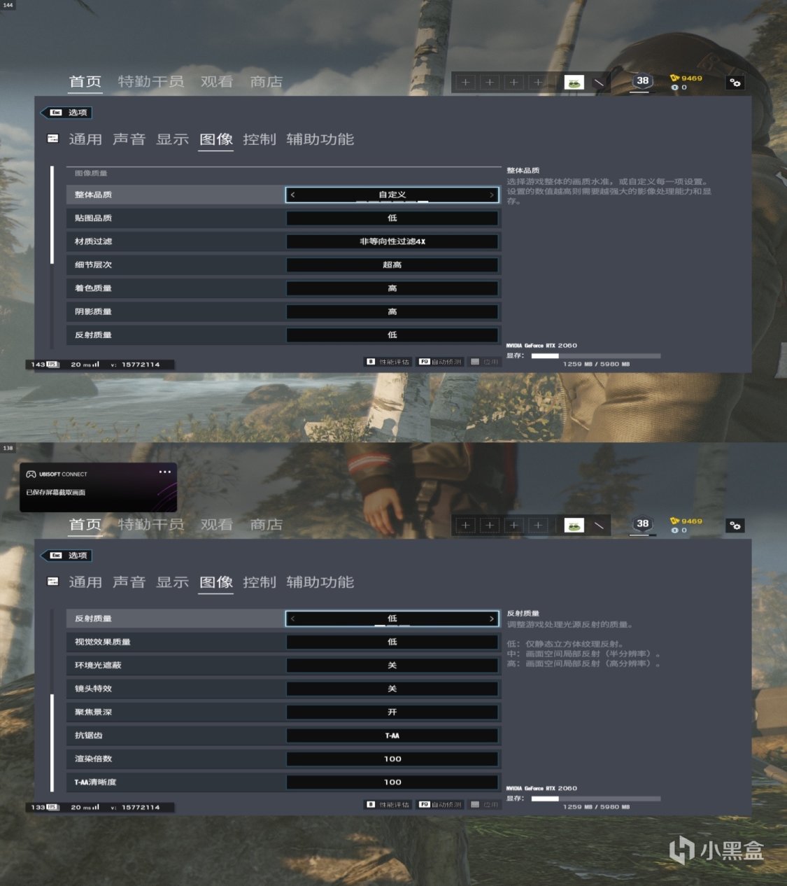 可以看到帧数并没有太大的变化,可以尝试着去调不同的设置,不用保存,只需要看右下角显存占用的程度,如果变化数值较大,那么肯定会影响帧数,另外,显存占用最好保持在60%以内,例如我的2060显存为6G,那么只要我的显存占用不超过3.6G,基本上不用太担心什么问题。关于着色质量和阴影质量,低和高的区别还是有点明显,条件允许的小伙伴还是尽可能开高。