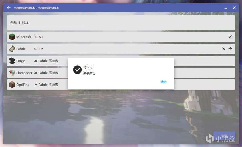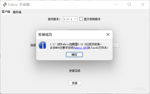 安装完成之后会提示“安装成功” 还会告知许多mod需要添加fabric API(可以把fabric api 理解为一个前置模组)