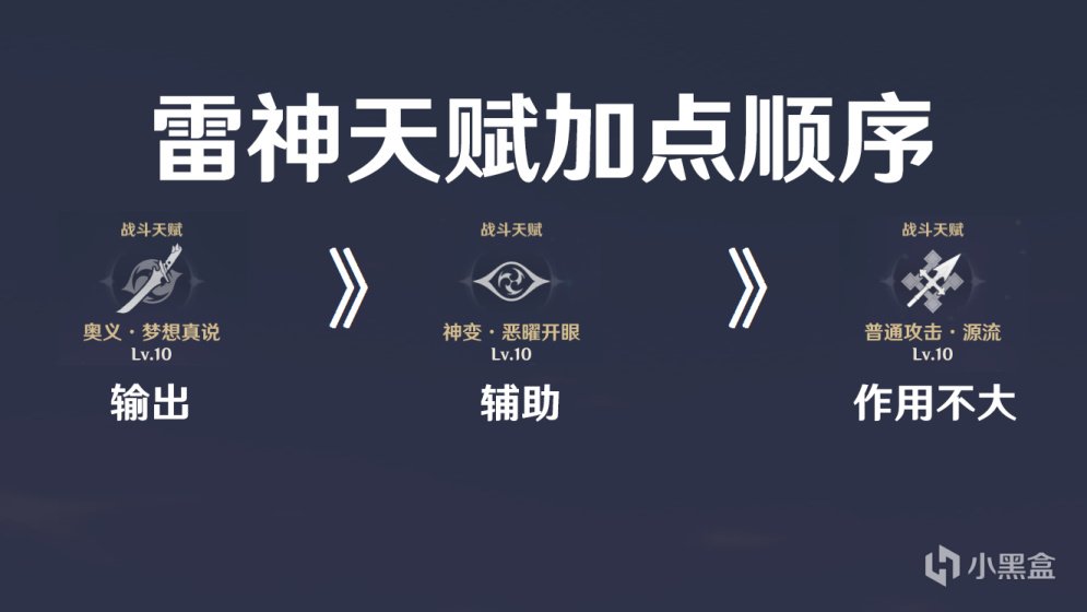 雷神的天赋加点,元素爆发>元素战技>普通攻击。元素爆发是主要的输出手段,并且打满时全队能量恢复大于15(6命打满全队大招CD减5秒)。元素战技输出还是次要的,看重其对全队的元素爆发伤害增幅,比例会随着天赋等级而提升。普通攻击无所谓,可加可不加,用处不大。