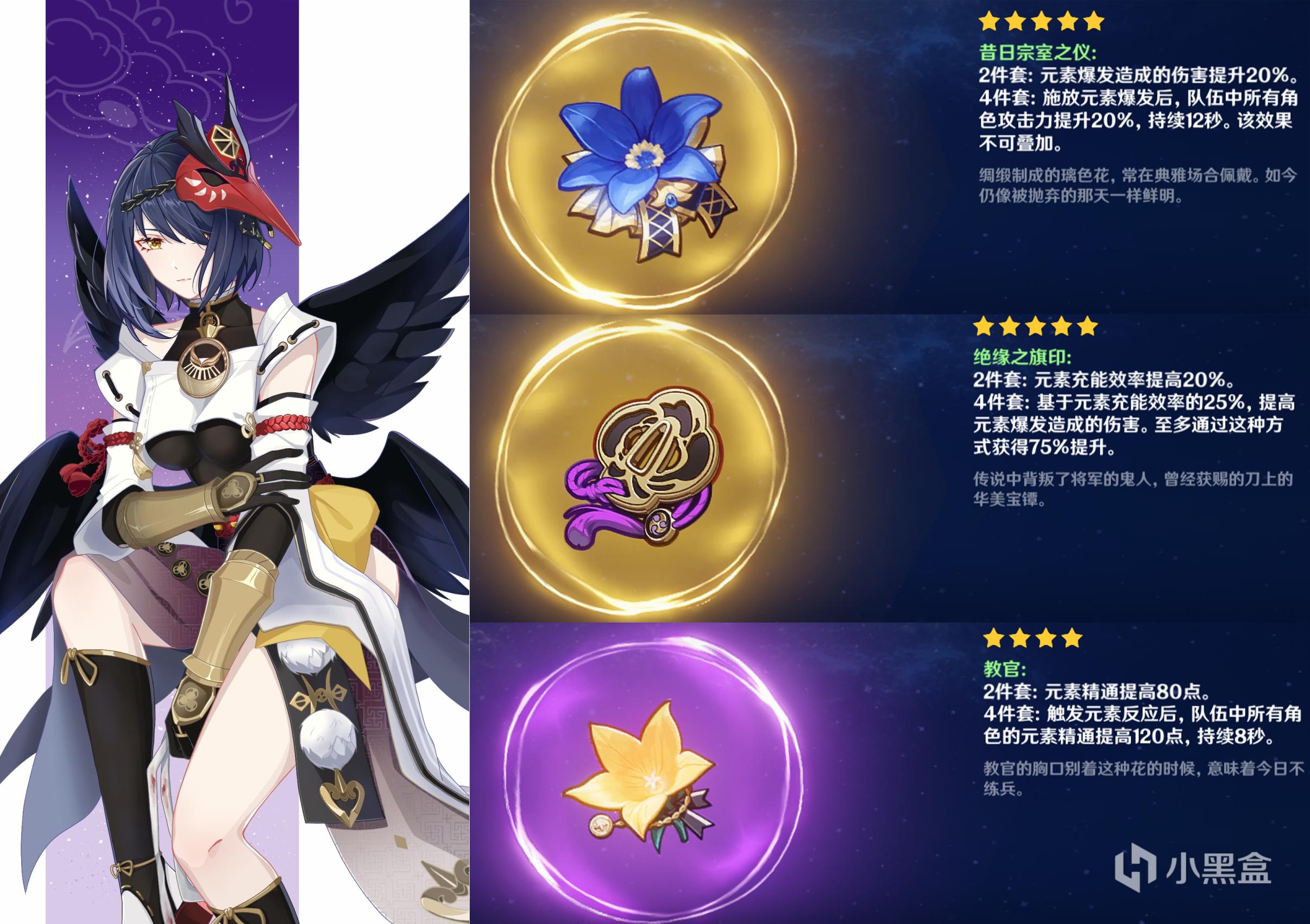 圣遗物套装说实话目前并没有特别适合的,多多少少都有些瑕疵。4宗室,开大后提升全队攻击力;4充能套,提升裟罗自身元素爆发伤害;4教官套,触发元素反应全队增加120元素精通。