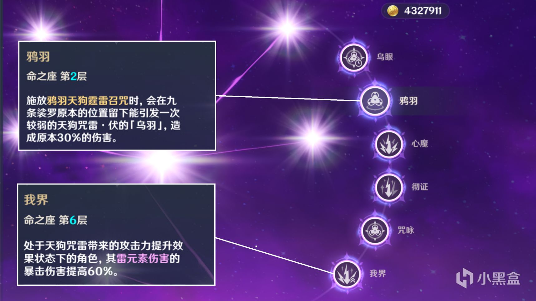 九条裟罗定位,增伤型辅助,关键命之座:2命、6命。0命的情况下培养价值较低,若是班尼特腾不开手,可考虑培养。2命决定了她增加攻击时的释放速度,位移后即可立马生成乌羽。6命提供了高额的雷伤角色暴伤增幅。