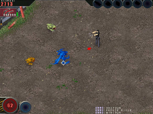 在怪物设计上,《孤胆枪手》的怪物种类较少,大概有爬虫、蜥蜴、蜘蛛、犀牛、蝙蝠、恐龙这几种,怪物的颜色代表了怪物的强度,绿色的怪物最弱,蓝色的最强,在通关过程中经常需要用到卡墙角这一技巧或者说是bug,游戏中的怪物只会直线行走,所以选择一个好的位置把他们卡住,就可以安稳输出了,不过犀牛有时会有激光炮,需要提前处理。