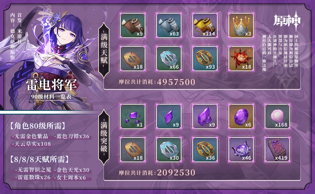♦图中右侧为90级满天赋所需,左侧为80级以及8/8/8天赋实际所需,旅行者可以自行按此进行收集,各部分材料的收集已在下方完善。另外新周本预计为“女士”本,之后会进行补充。