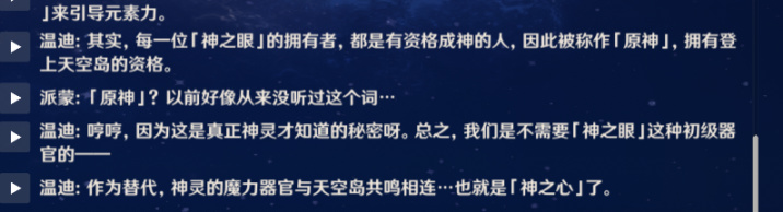 拥有了神之眼的人,就拥有了成神的资格,就可以登上天空岛。登上天空岛是成为天理维系者的一员还是燃尽神之眼中愿望所蕴含的力量都有可能。看上了你的强烈愿望,并给予了你力量,成为天理维系者的一员,可能吗?不可能,当最初的人妄图登上诸神的庭园,换来的就是冰雪的到来,文明的下一轮循环。