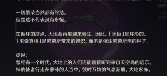 那之后,就是天空岛让尘世七执政掌管提瓦特,自己退居二线,形成了新的制度,新的永恒。此后,魔神战争开始,魔神战争的七位胜利者成了尘世七执政分管七个地区。这样即使愚昧的人获得了智慧,也只会质疑人信仰的七神。