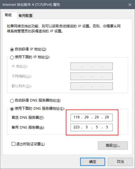 解决方法也很简单,取消自动获取DNS,使用自己设定的服务器即可。咱国内的HXD就直接使用阿里或者腾讯提供的DNS服务就好,这两货都挺稳定安全的,挑个顺眼的用就行。