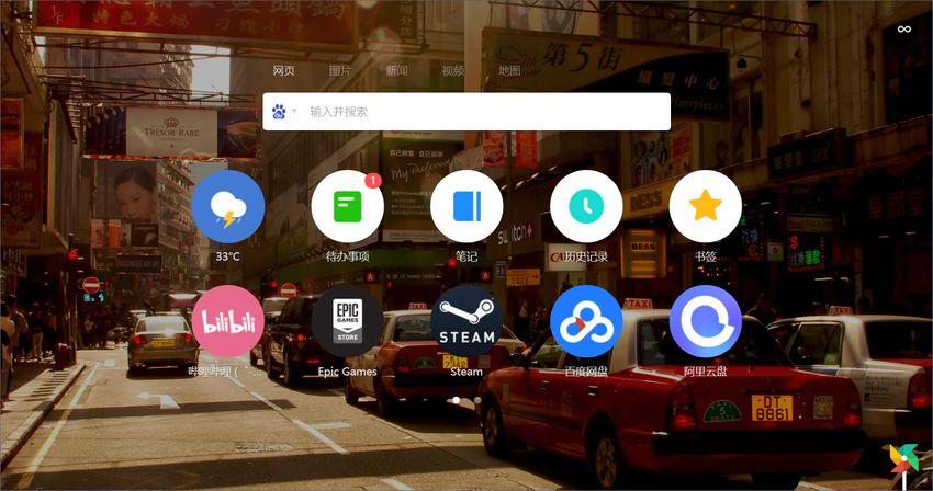 可让你自定义新标签页(当主页使),该插件安装完默认不启用,需要手动配置下。这是效果图: