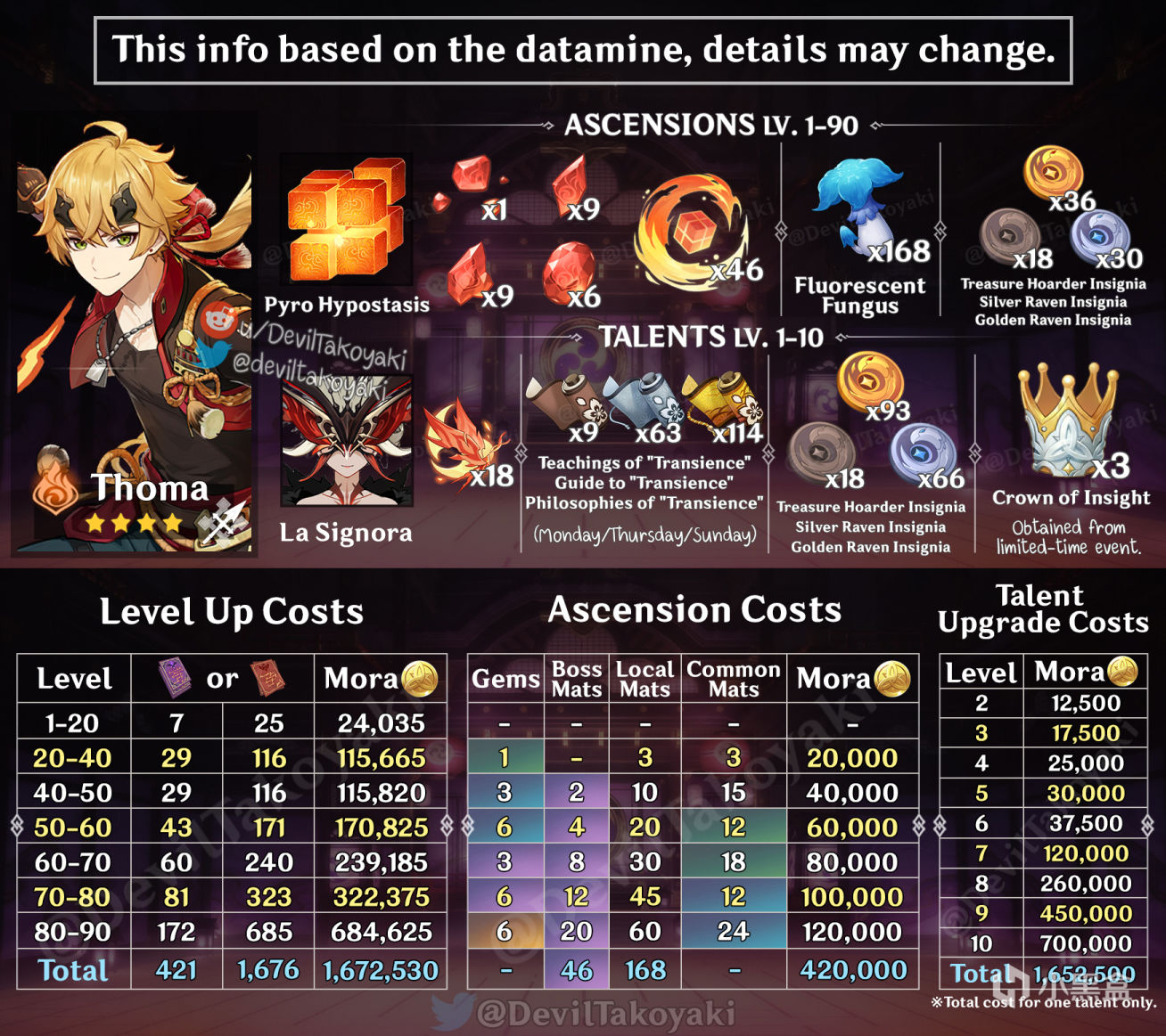 这些是托马的突破材料,需要打女士周本、无相之火、盗宝团,天赋书需要『浮世』至于这个蓝色的蘑菇是2.2版本鹤观的特产——幽灯蕈,暂时无法收集。通过目前数据来预测,托马大概率是佩戴4充能套+鱼获,天赋QE互点。