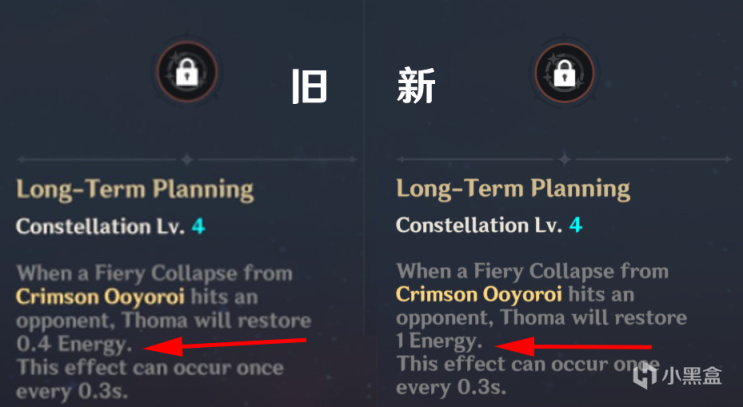 托马命之座4命『用臣的久计』加强,每段炽火崩破命中敌人后的能量恢复提升:0.4=>1。由于2命『僚佐的才巧』的效果,托马的真红炽火之大铠状态可持续18秒,若是能够持续触发炽火崩破,托马可恢复18点能量。
