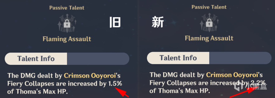测试服托马进行了微弱的调整,天赋烈火攻燔:真红炽火之大铠的炽火崩破造成的伤害提高,相当于托马生命值上限的1.5%=>2.2%。最终转换下来的数值大概也就每段炽火崩破多了几百点伤害。