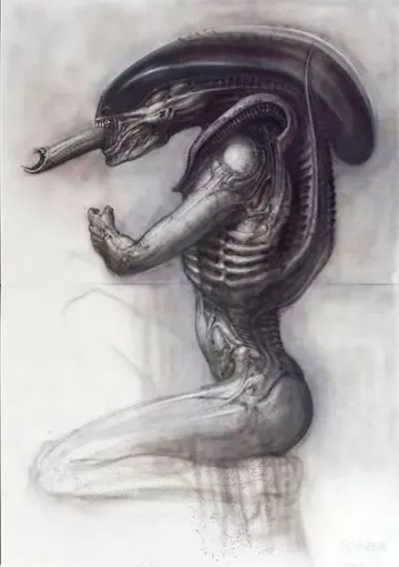 从《异形1》里登场的标准异形说起,它是由异形胚胎寄生在人身体上而产生的异形,于是有着明显的人体构造特征:它的身体就是一个特别纤细,骨头裸露在外面的人体,但是这种骨头又体现出金属和机械化的特征。仿佛被收缩、变形的纤细形体,则是吸取了fetish文化中紧身衣的灵感,暗含一些色情的味道。