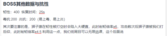 原理讲起来也挺容易的,首先狮子猿有小后仰和大后仰,小后仰硬直期间削韧倍率x6,大后仰硬直期间削韧倍率x4.5,利用这个点,我们要卡好韧性,首先是不能再在大后仰期间打空韧性,一定要留一点韧性,等到狮子猿离开硬直后再打空,不然浪费了玩家的削韧,其次就是这个打法只适合一二周目的玩家,因为高周目削韧会有减少。