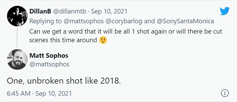 推特上一位网友询问:“能不能说一下,将延续一镜到底,还是这次会有剪辑场景?”。《战神4》的叙事总监Matt Sophos回到:“一镜到底,如同2018年(战神4)一样。”这下粉丝们可以放心了。