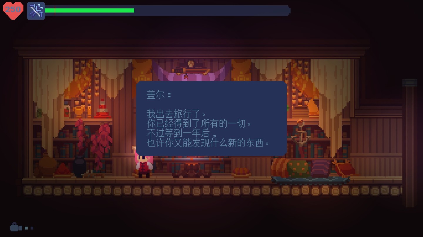 当我听说一个像素横板过关游戏需要30h才能通关主线的时候,我觉得是真的离谱。但事实证明这款游戏的剧情和地图容量确实是多到离谱,主要角色、次要角色甚至是大量只有一面之缘的npc都塑造的极其丰满,每个城镇、每个地区都有别具一格的风土人情,流连于各个地方给当地居民提供帮助,我个人觉得甚至可以和BotW相提并论(当然体量差距还是很大,必然不可能达到塞尔达的水准)。而在主线剧情上也是诚意满满,至少和ori有得一拼。