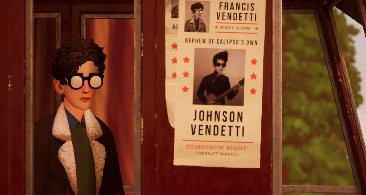 在游戏中,主角Francis Vendetti的叔叔是一位已故的著名民谣歌手,受其影响,人们也希望Francis能够作为其才华的继承人,成为一名民谣音乐人,并要求他在叔叔的周年纪念日活动上登台演唱。