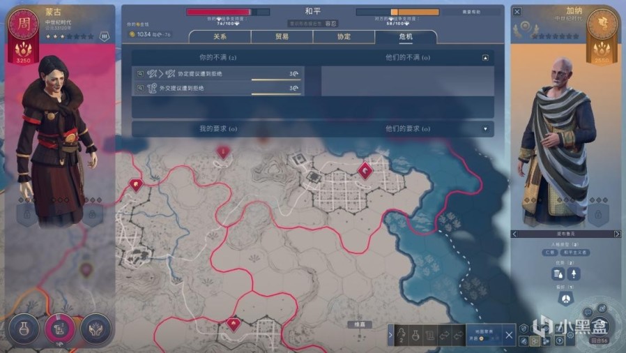 战争狂狂怒!《孙子兵法·谋攻篇》有云“上兵伐谋,其次伐交,其次伐兵,其下攻城”。看的出开发组似乎更鼓励市政系统和外交系统,因而有了“战争支持度”这个略显蛋疼的设定,对面的战争支持度一旦降到0就会投降,但我方却强制性必须接受对方的投降而不能继续灭国,虽然可以通过“割完全部领地、占城劫掠”等手段迫使对方无法投降,但开发组似乎并不鼓励“战争狂”行为,而是不时干扰你的节奏,对方一投降,你就得乖乖继续攒战争支持度,让你把注意力转向内政外交上,可是《人类》的外交系统做的并不出彩,条款太少,操作空间窄,几无深度,页面上寥寥无几的选项实在没什么深入研究的欲望。